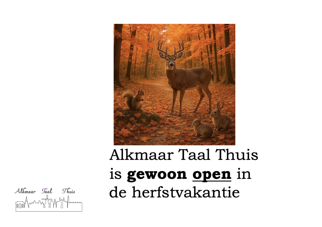 Volgende week is het herfstvakantie op de scholen. Gelukkig zijn wij gewoon open! Kun je bij ons je Nederlands nog eens extra oefenen! Zien we je bij ons taalcafè?
