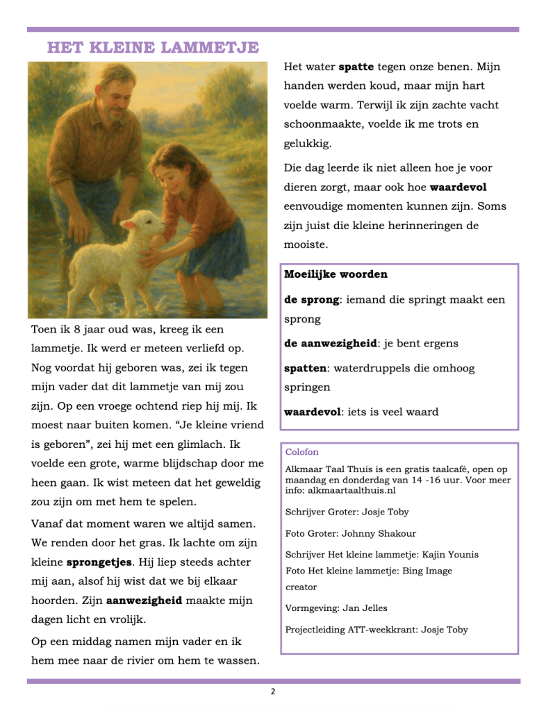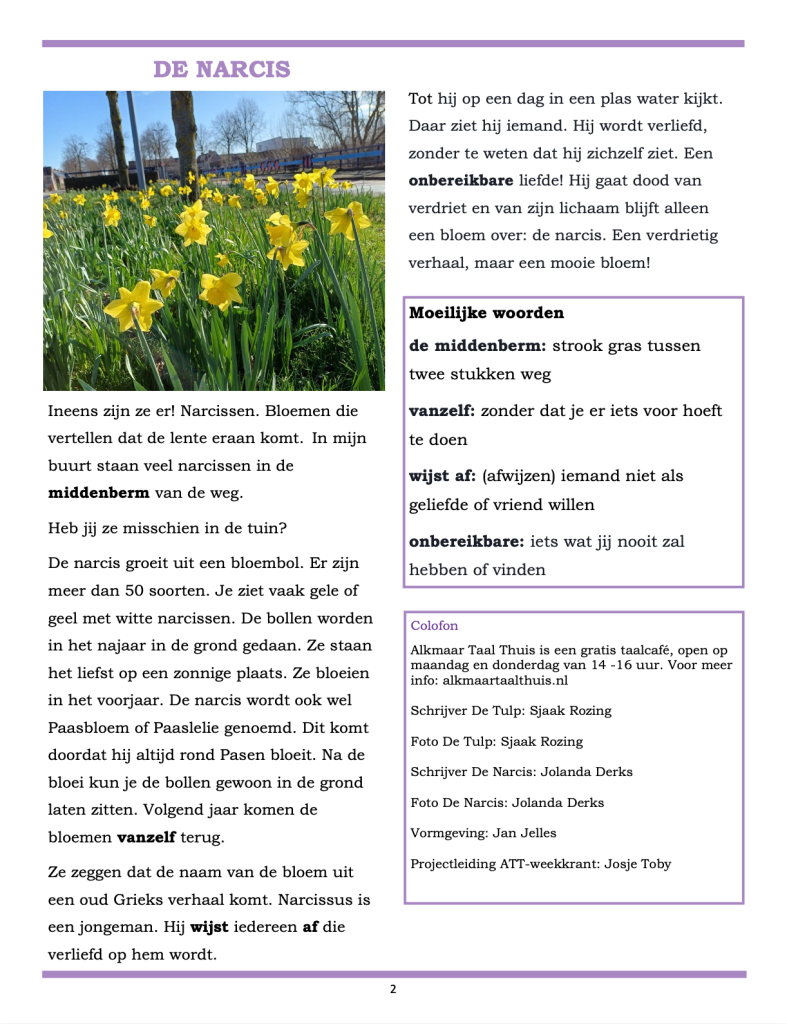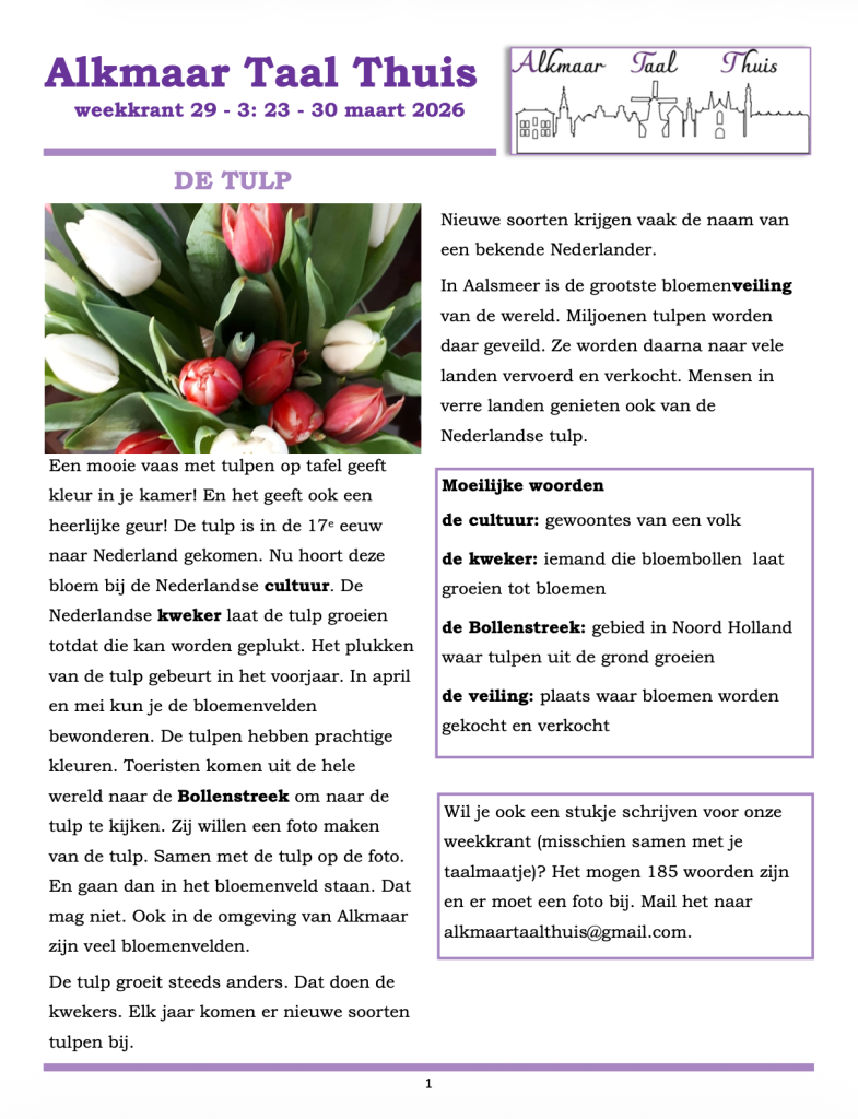 Elke week maken wij met een groepje vrijwilligers een gratis weekkrant in makkelijke taal. De onderwerpen hebben meestal te maken met Alkmaar, soms over dingen die bij Nederland horen. Wilt u deze gratis weekkrant ook ontvangen via de email? Dat kan! Mail naar info@alkmaartaalthuis.nl, dan zorgen wij ervoor dat u elke week een pdf via de mail toegestuurd krijgt!